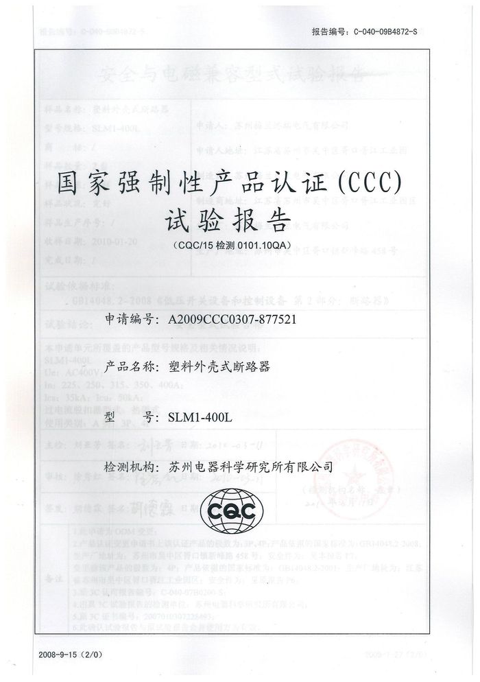 SLM1-400L塑殼斷路器資質(zhì)證書