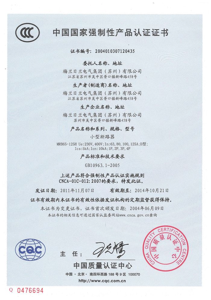 MRB65-125H小型斷路器資質(zhì)證書