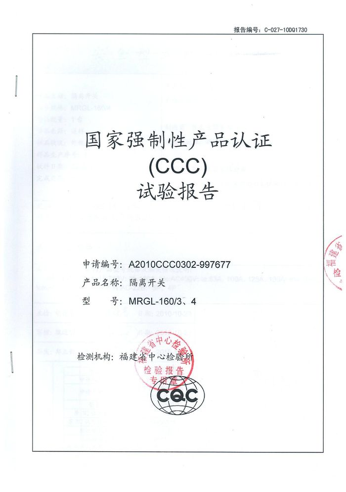 MRGL-160隔離開(kāi)關(guān)資質(zhì)證書(shū)