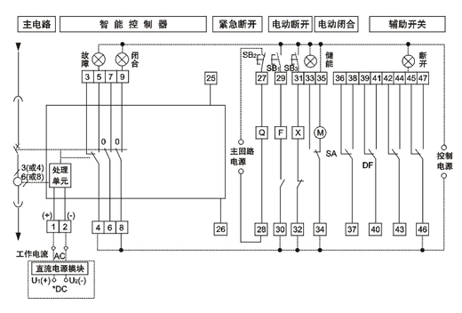 斷路器總體接線端子共有47個,接線簡單、便于用戶使用