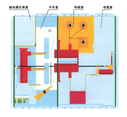 斷路器隔室內安裝了特殊軌道供手車移動。斷路器在試驗位置與工作位置之間移動時.隔離活門自動打開或關閉,保障了工作人員不觸及帶電體。手車可在柜門關閉的情況下被操作,通過觀察窗可看到手車在柜內所處的位置。同時看到車上的任何功能標志。