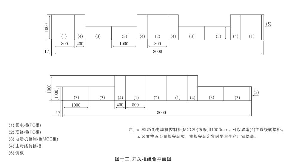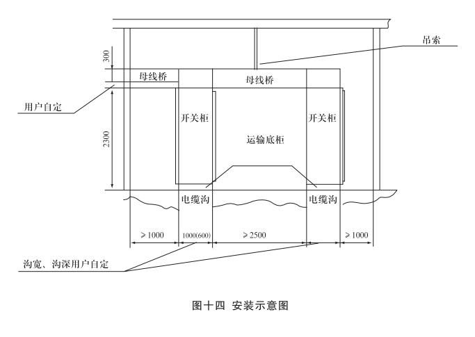 安裝:開關(guān)柜就位。找準(zhǔn)位置,按圖十一所示進(jìn)行焊接,焊接節(jié)柜和焊長由用戶確定,產(chǎn)品安裝與配電室的相對(duì)位置參考圖十二,其中吊索是否安裝由用戶確定,制造商提供的原則是:當(dāng)母線橋的長度大于3米時(shí)應(yīng)考慮安裝吊索。但是,當(dāng)母線橋的電流大于或等于2500A時(shí),其長度為2.5米時(shí)也應(yīng)安裝吊索。